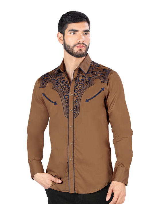 Camisa Vaquera Bordada Manga Larga Beige/Camello Oscuro para Hombre 'El General' - ID: 44336