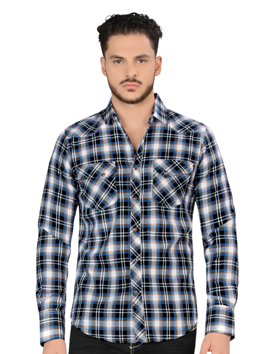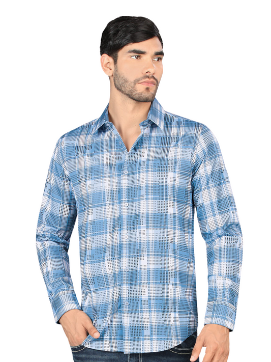 Men's Long Sleeve Checkered Printed Denim Shirt 'Montero' - ID: 4013